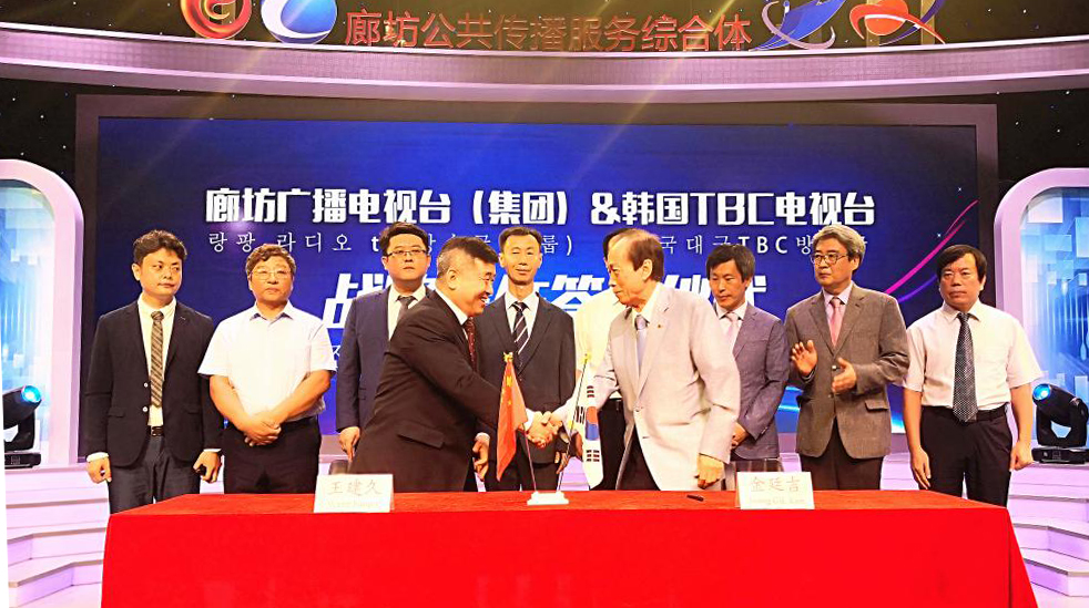 圖為廊坊廣播電視臺(tái)黨委書(shū)記、臺(tái)長(zhǎng)王建久(左)、韓國(guó)TBC電視臺(tái)社長(zhǎng)金廷吉分別代表雙方簽約,雙方達(dá)成戰(zhàn)略合作。