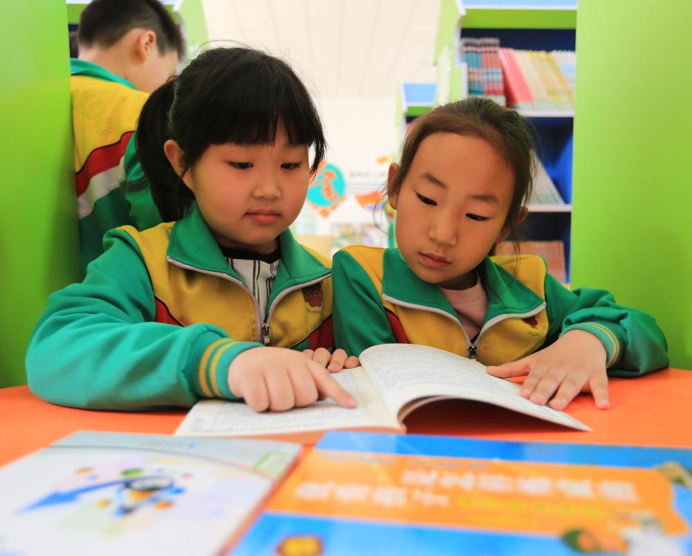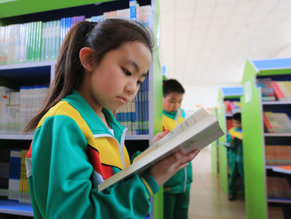 圖為固安縣第四小學的學生正在校內(nèi)圖書館讀書。