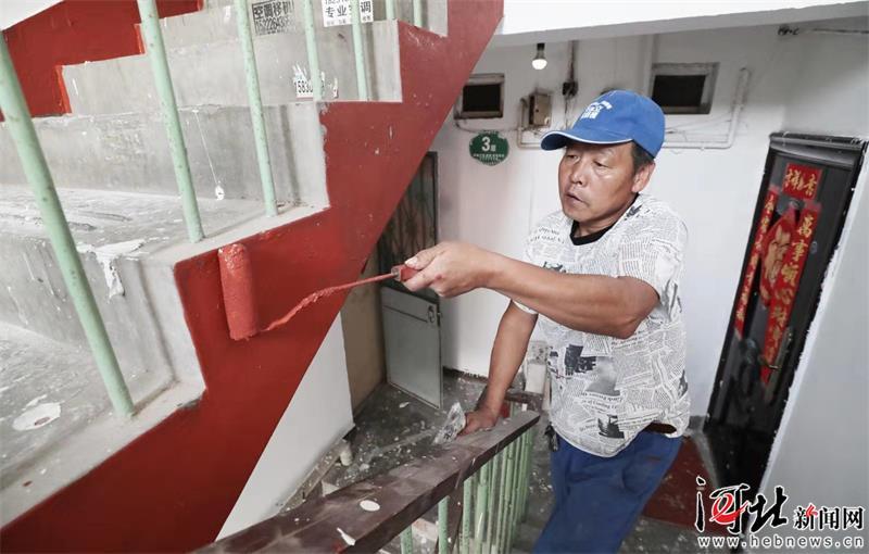 圖為9月3日,廊坊市區(qū)華興里供電小區(qū)改造現(xiàn)場,工人正在刷新樓道墻壁。 賈珺攝