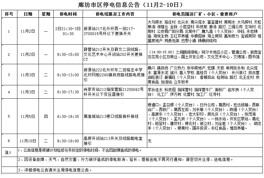 上一篇:廊坊市區(qū)停電信息公告(11月9-12日) 下一篇:廊坊市區(qū)停電信息變更公告(10月30日)