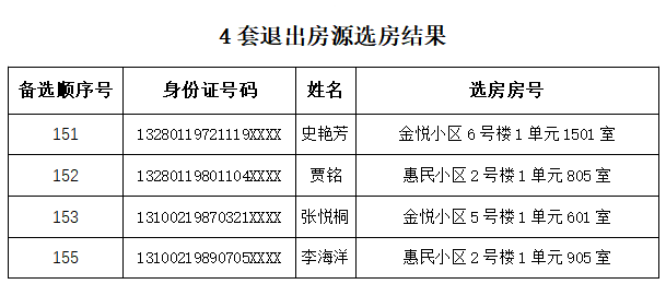 廊坊市區(qū)2019年金悅小區(qū)、惠民小區(qū)二期限價商品房4套退出房源選房工作于2019年3月25日開展,截止目前,4套退出房源已全部銷售完畢,現(xiàn)將選房結(jié)果公示如下: